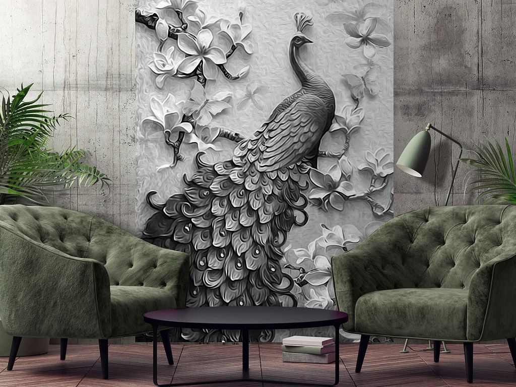 Флизелиновые фото обои с цветами 206 x 275 см Птицы - Черно-белый павлин (13594VEA)+клей