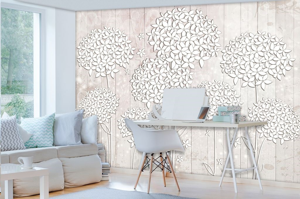 Отзывы о Флизелиновые фотообои искусство 254x184 см Пушистые белые цветы на светлых деревянных досках (3502V4)+клей