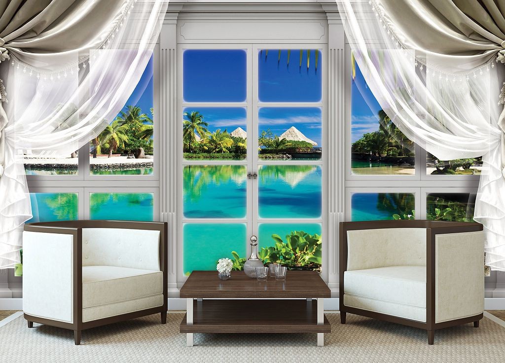 Отзывы о Флизелиновые фотообои природа 254x184 см 3D Вид из большого окна со шторами на Гавайи (10630V4)+клей