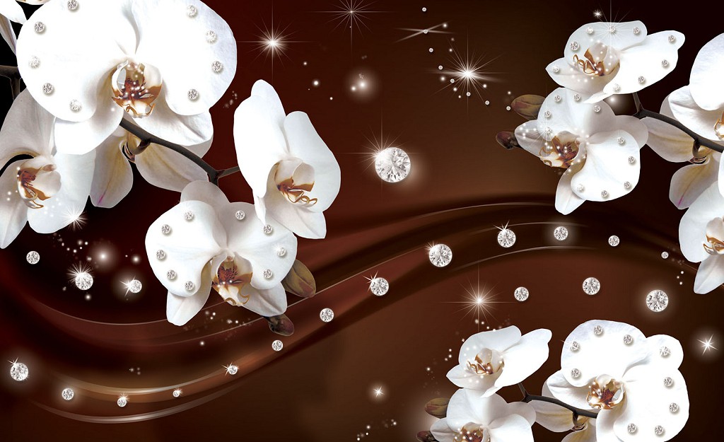 Отзывы о Флизелиновые фотообои на стену цветы 312x219 см 3Д Белые орхидеи и диаманты на темно-коричневом фоне 2309VEXXL+клей