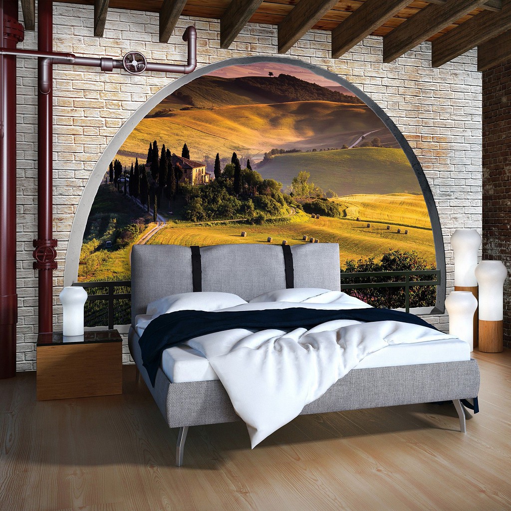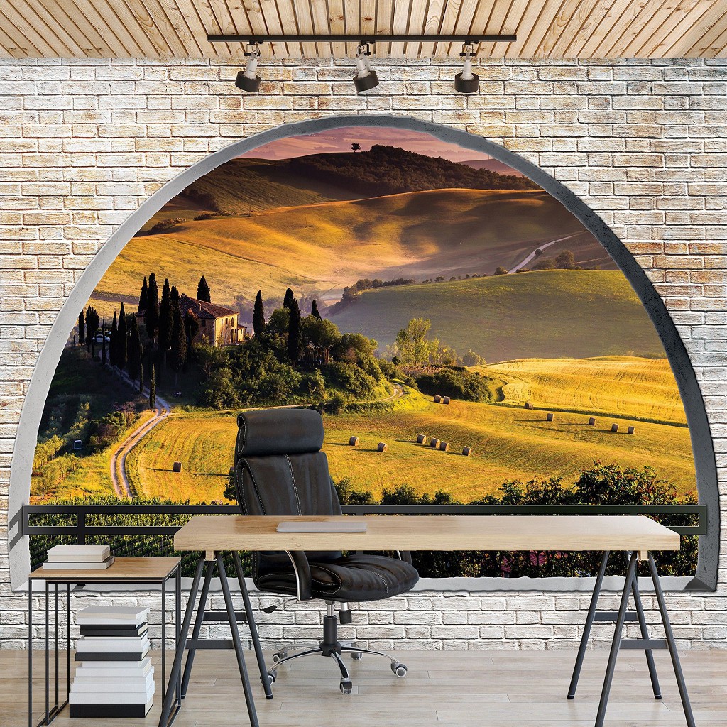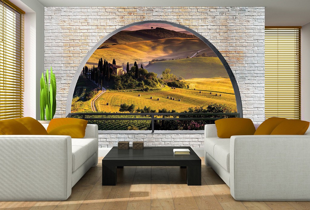 Природа флизелиновые фотообои 312x219 см 3Д Тоскана за полукруглым кирпичным проемом (2839VEXXL)+клей