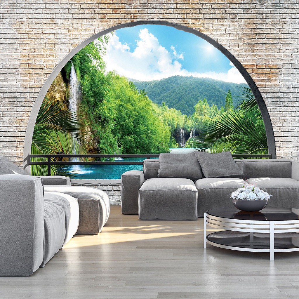 Отзывы о Природа водопад флизелиновые фотообои 312x219 см 3Д Вид на залив за полукруглым кирпичным проемом (2837VEXXL)+клей