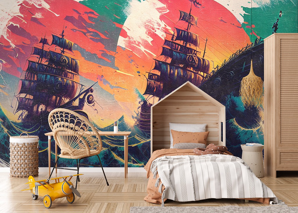 Отзывы о Флизелиновые фотообои в спальню над кроватью детские для мальчика 312x219 см Нарисованные два корабля в море (14609VEXXL) +клей