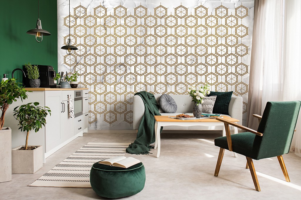 Флизелиновые фотообои 368 x 280 см Абстракция Соты - Золотые шестигранники на белом мраморе (13724V10)+клей