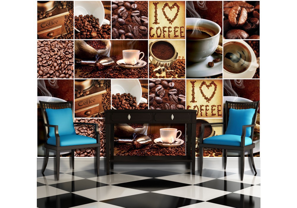 Флизелиновые фотообои на кухню 368x280 см Я люблю кофе коллаж чашки и зерна (10449V10) +клей