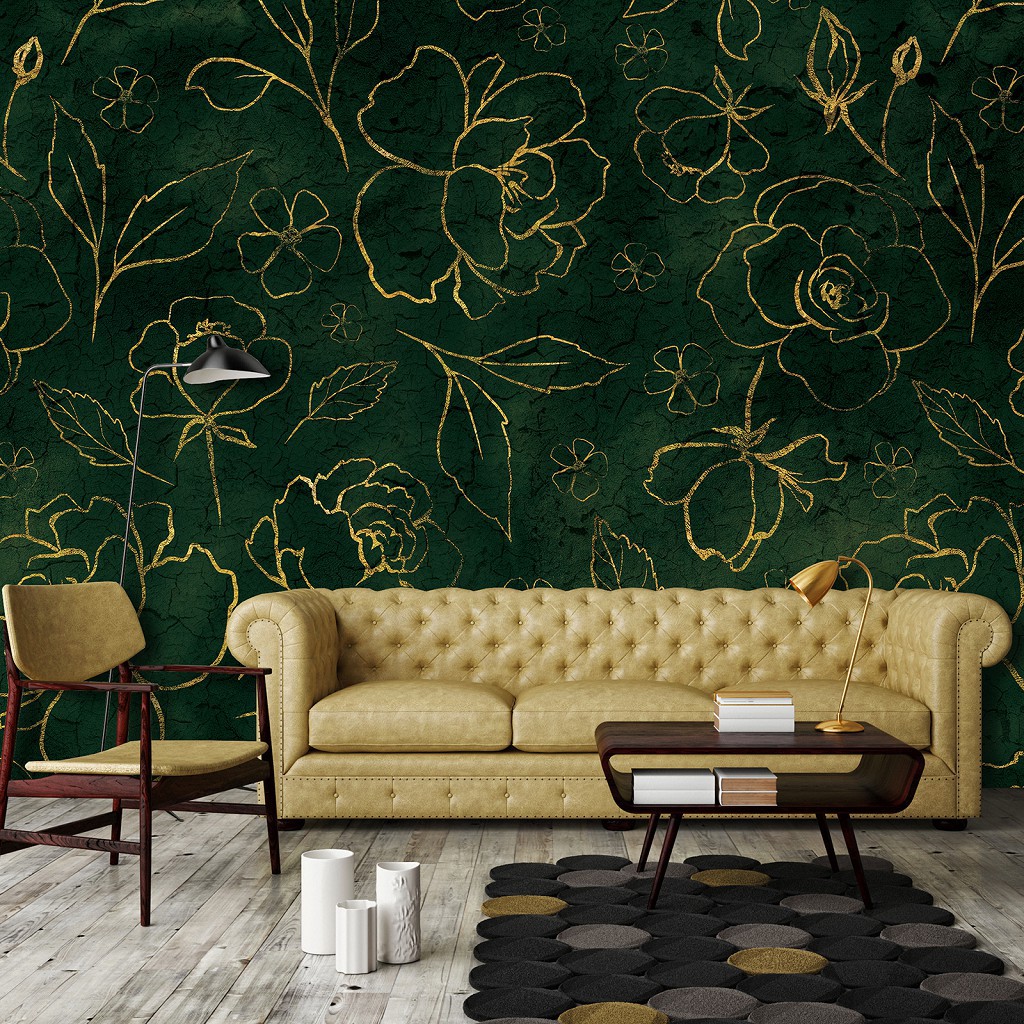 Флизелиновые фотообои растительные 416 x 254 см Цветы - Золотые розы на зеленом фоне (13650VEXXXL)+клей