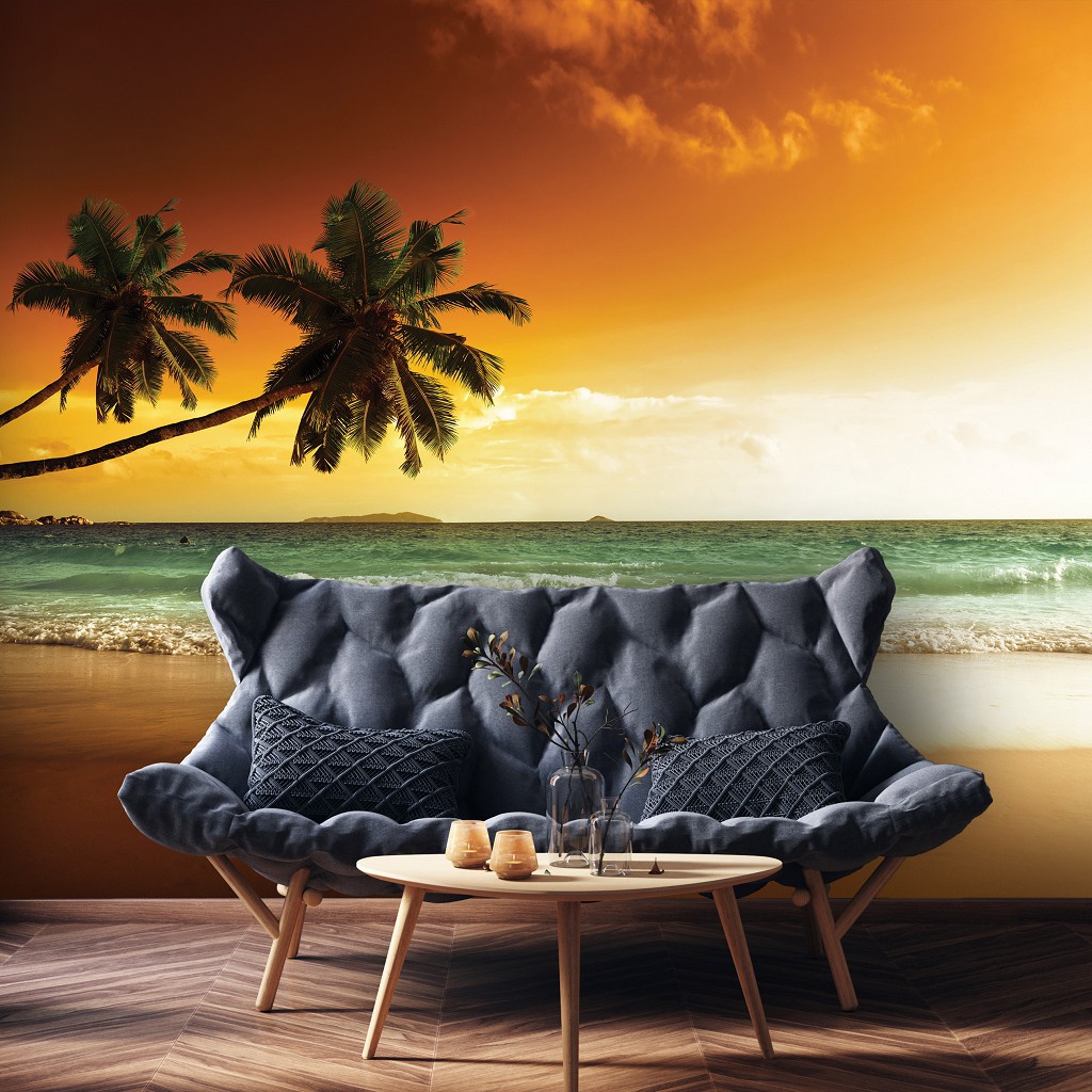 Отзывы о Красивые флизелиновые фотообои на кухню 416x254 см 3D Природа Закат Две пальмы на берегу океана (14614VEXXXL) +клей
