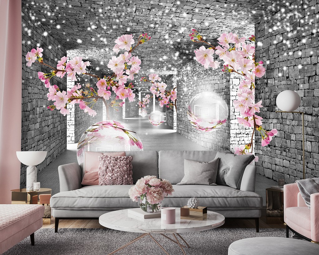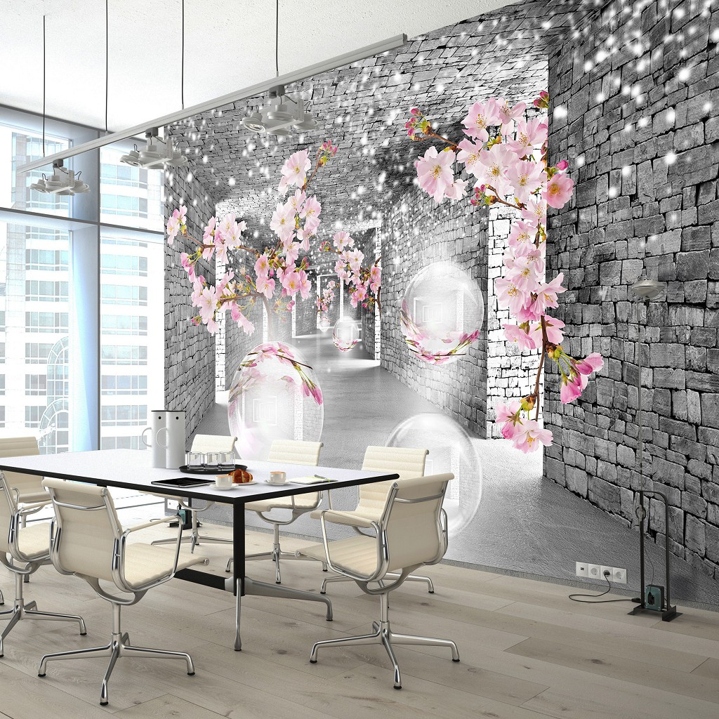 Флизелиновые фотообои 416x254 см 3D коридор Серый кирпичный туннель с цветами и шарами (14037VEXXXL) +клей