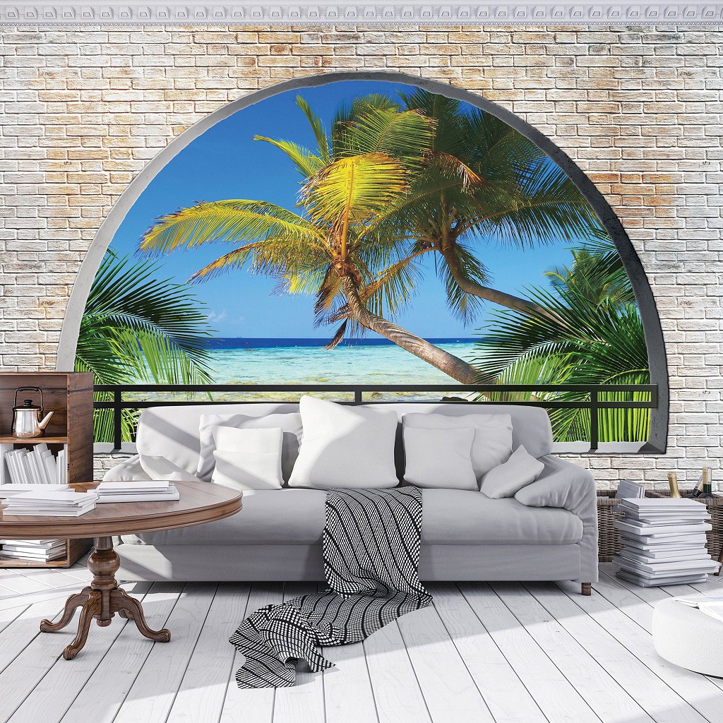 Красивые флизелиновые фотообои природа море пляж 416x254 см 3Д Вид на пальмы за полукруглым кирпичным проемом+клей