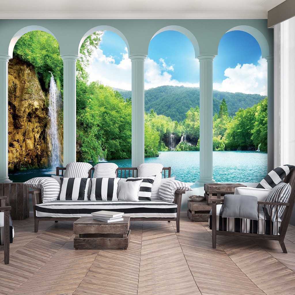 Флизелиновые фотообои красивые 416x254 см 3Д Водопад за четырьмя арками (2353VEXXXL)+клей