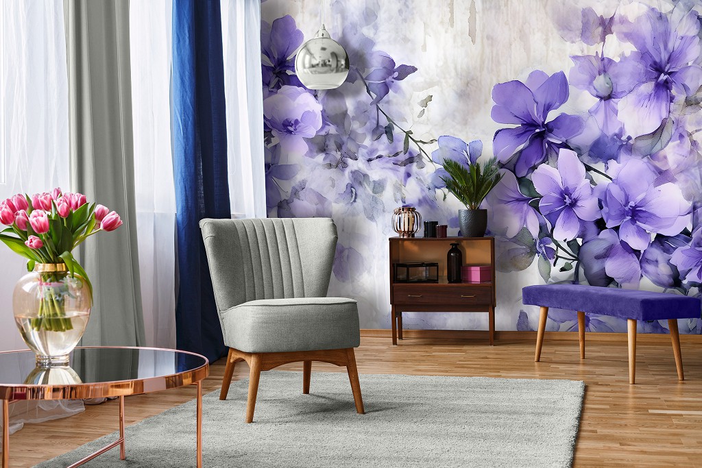 Отзывы о Флизелиновые фотообои в интерьере 416x254 см Фиолетовые оттенки цветов на сером фоне (14752VEXXXL) +клей