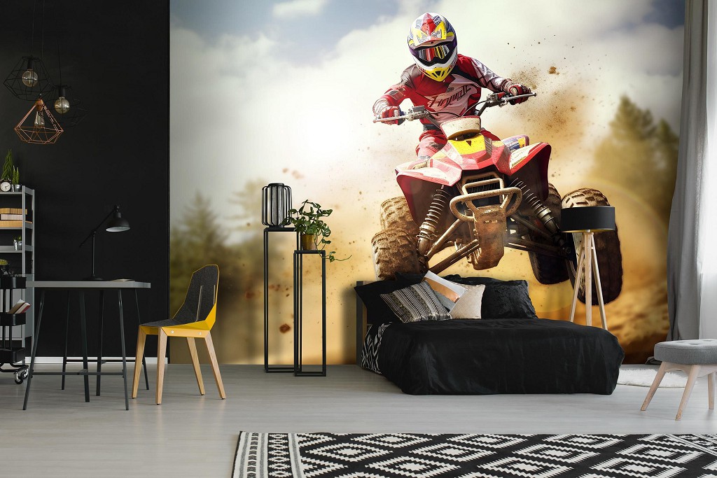 Отзывы о Флизелиновые детские 3д фотообои для мальчиков 416x254 см Гонщик в моменте в воздухе на квадроцикле (14711VEXXXL) +клей