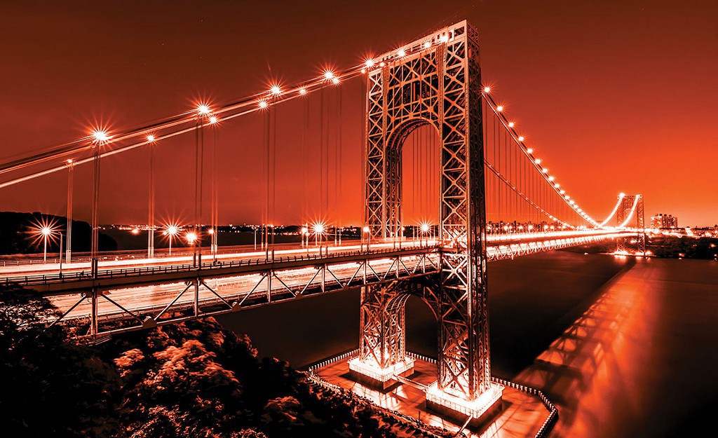 Флизелиновые фотообои в спальню над кроватью фото 416x254 см Мост Джорджа Вашингтона в темно-оранжевом цвете+клей