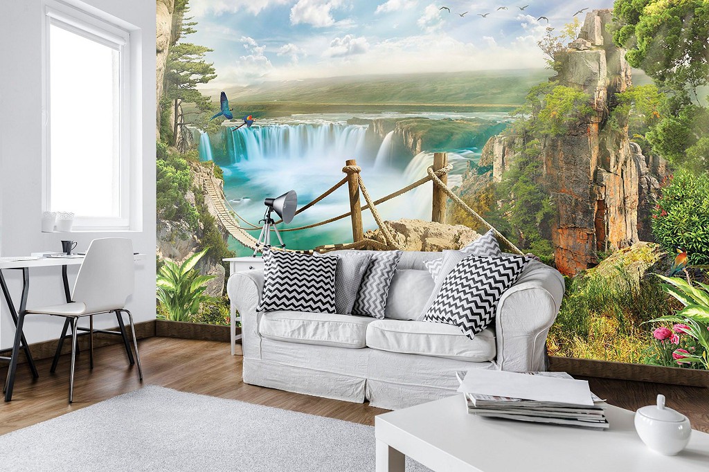Природа 3д Пейзаж флизелиновые фотообои 416x254 см Подвесной мост над водопадом (10515VEXXXL) +клей