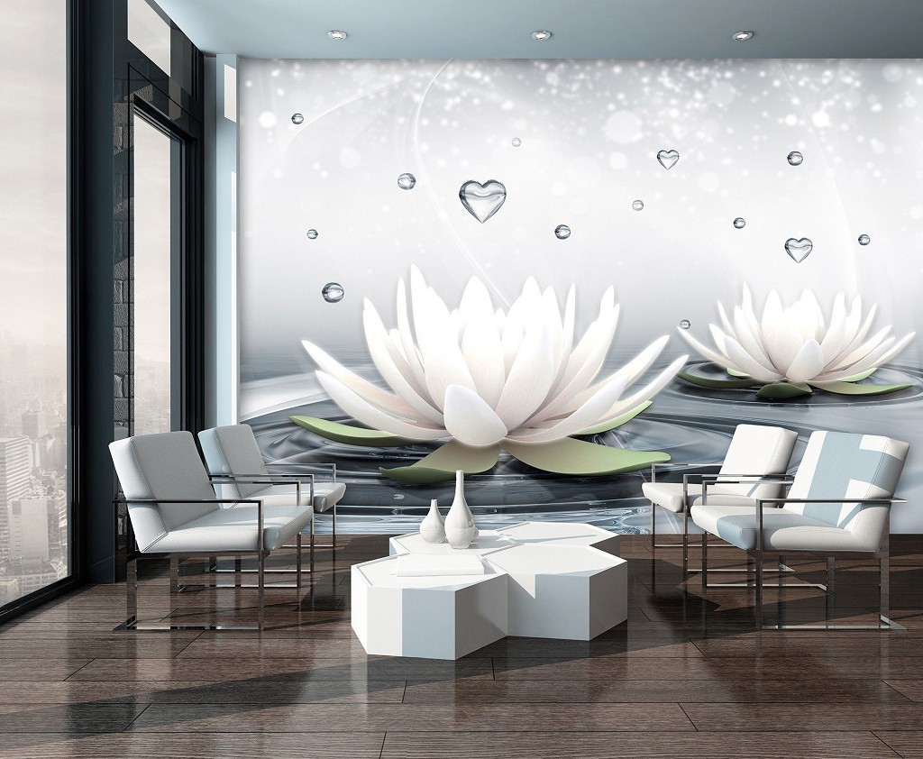 Отзывы о Флизелиновые фотообои 3д большие цветы на светло-сером фоне 416x254 см Две белые лилии на воде (3509VEXXXL)+клей