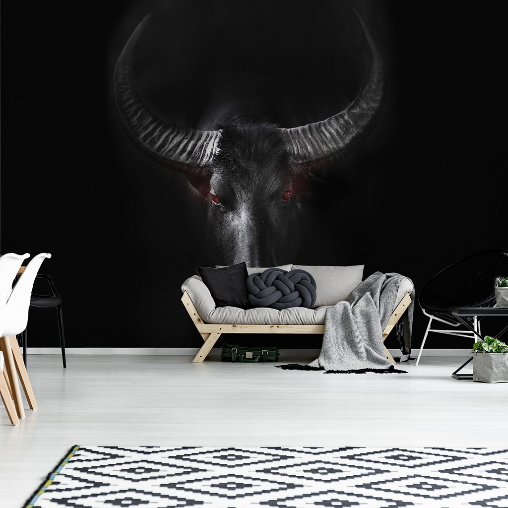 Отзывы о Флизелиновые 3д фотообои с животными в интерьере 416x290 см Черный бык на темном фоне (11897VEXXXXL) +клей