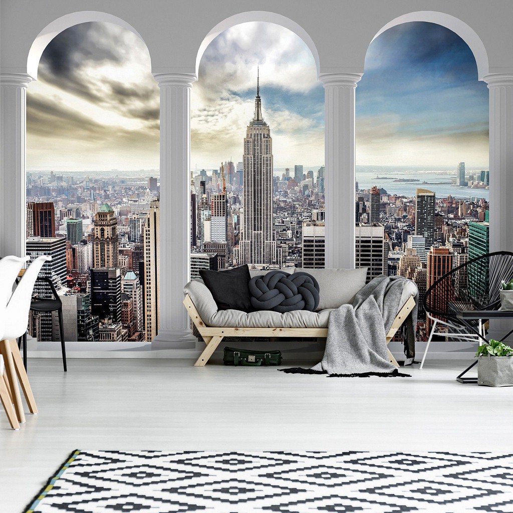 Фотообои флизелиновые 3D 416х254 см Вид на город Нью Йорк через колоны (2345VEXXXL) напечатаны на флизилине(Vlies) и состоят из 4-х вертикальных частей. Ширина фотообоев 416 см, высота - 254 см. Изделие комплектуется клеем и инструкцией. Фото обои весят 1,9 кг и имеют плотность 140 г/м2. Благодаря эффекту 3D Ваша комната визуально увеличится. На фотообоях изображен вид на небоскребы города Нью-Йорк.
