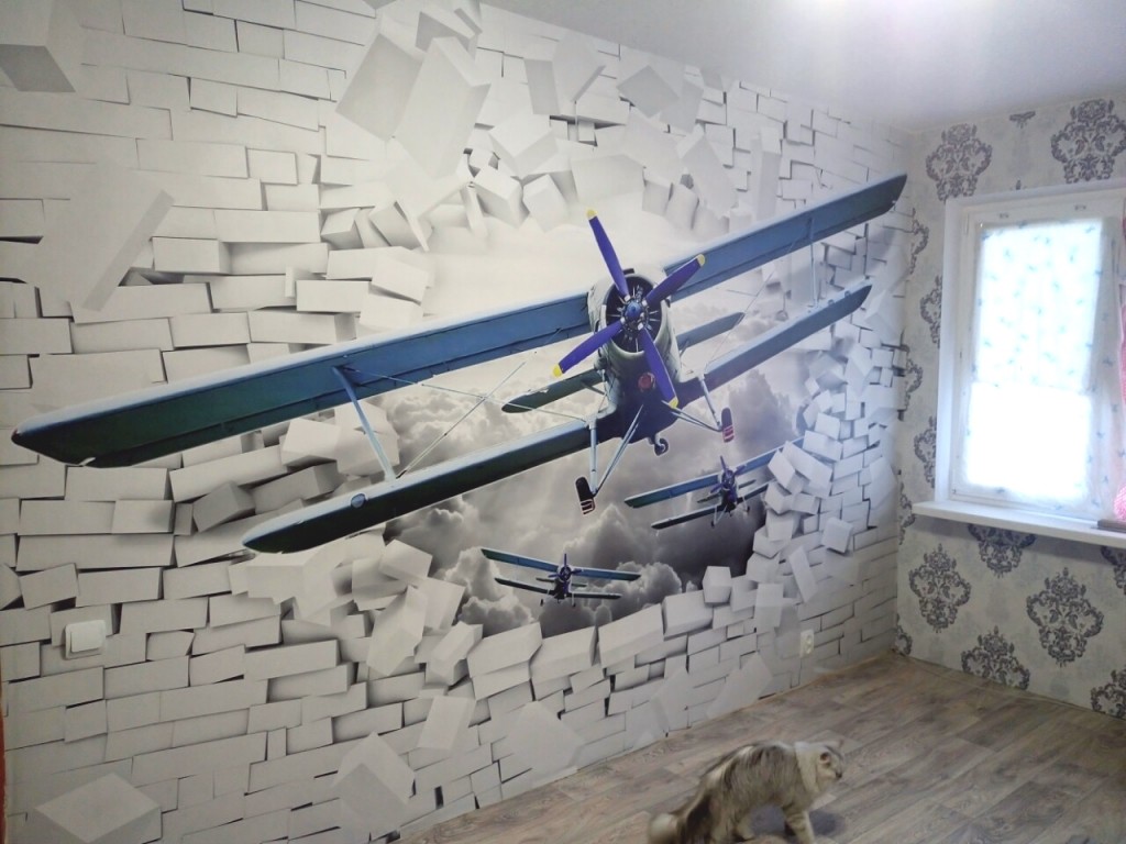 Отзывы о Флизелиновые фотообои в детскую мальчика 416x254 см Самолет вылетает из 3Д кирпичной стены (10407VEXXXL)+клей