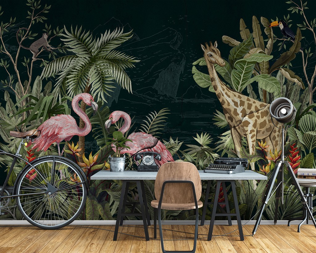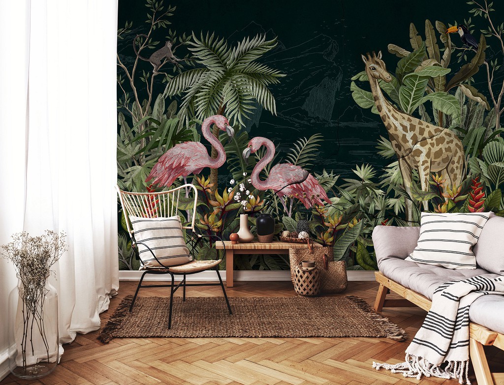 Фотообои флизелиновые 416 x 254 см Нарисованные жираф и два фламинго в тропиках (13931VEXXXL)+клей