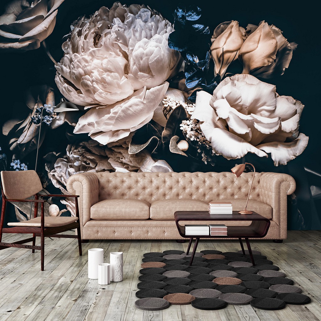 Відгуки 3D Квіти Півонії Троянди фотошпалери 368 x 254 см Дивовижний букет на чорному тлі (13524P8)+клей