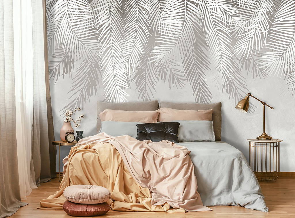 Флізелінові фотошпалери сіро-бежеві пір'я 368 x 280 см Природа - Пальмові листя (13934V10)+клей