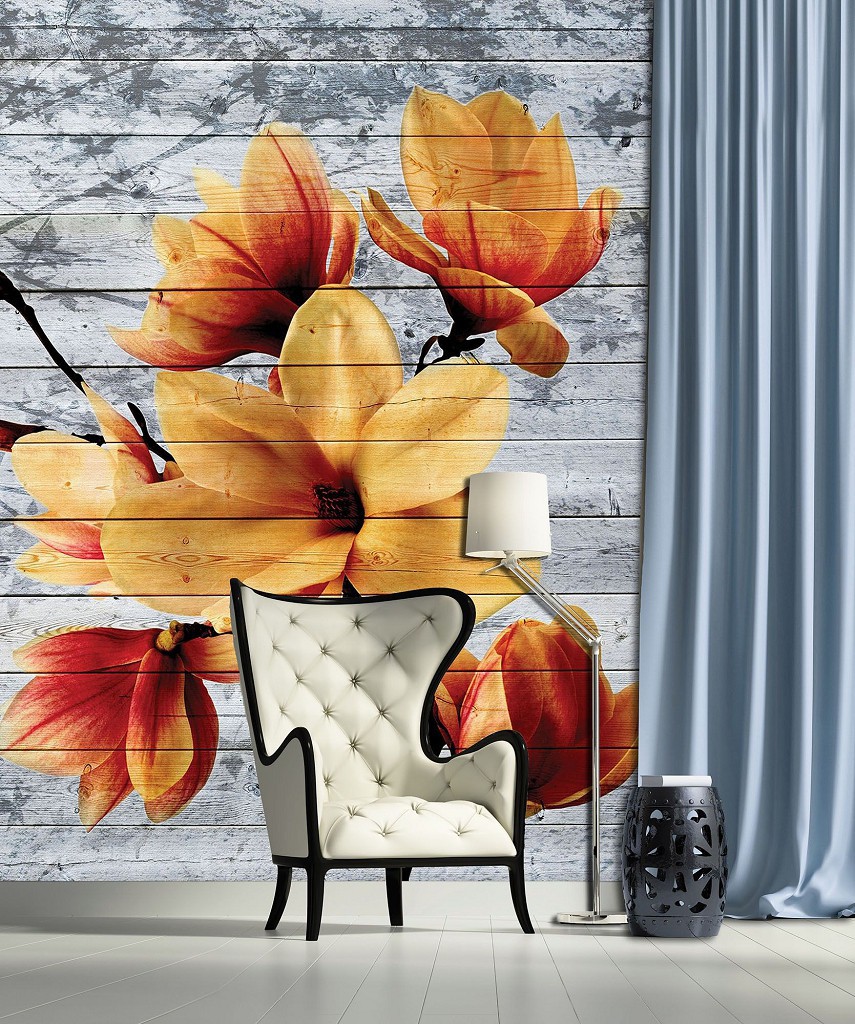 Флізелінові фотошпалери Магнолії на сірий фон 206x275 см Помаранчеві квіти на дерев'яні дошки (3521VEA)+клей