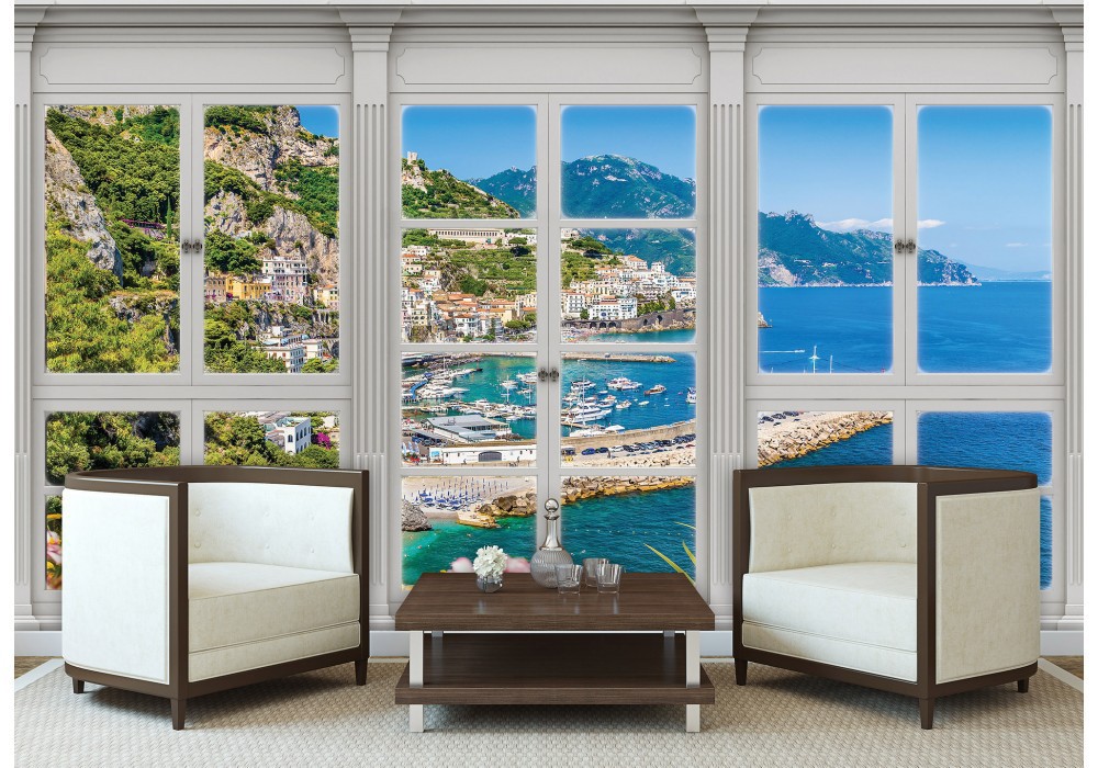 3D флізелінові фотошпалери 254x184 см Бірюзове море вид з великого вікна (10644V4)+клей