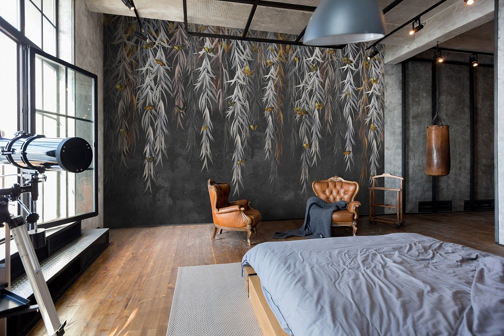 Флізелінові фотошпалери 254x184 см Листя та метелики на темній бетонній стіні (14559V4)+клей