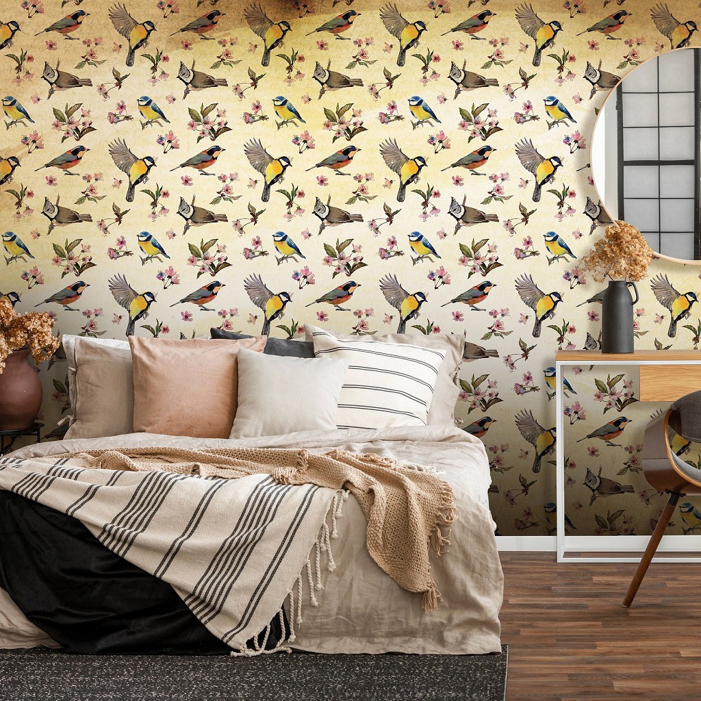 Відгуки Флізелінові фотошпалери для спальні Вінтажний стиль 254x184 см Маленькі пташки та квіткові візерунки (10402V4)+клей