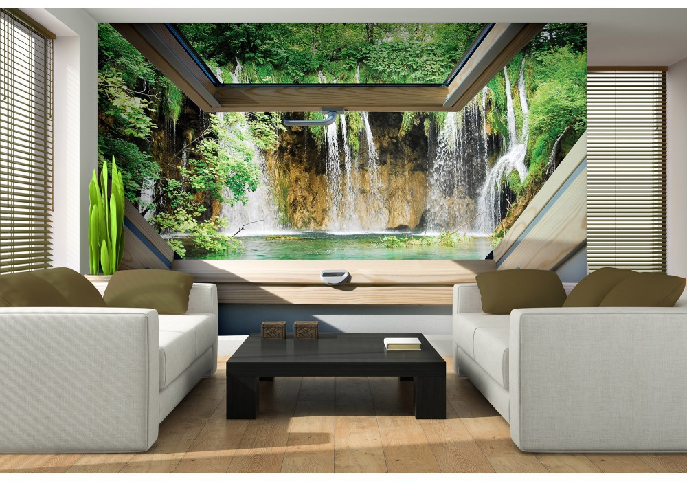 Флізелінові фотошпалери фото природи 254x184 см 3Д Вид з мансардного вікна на ліс з водоспадом (10408V4)+клей