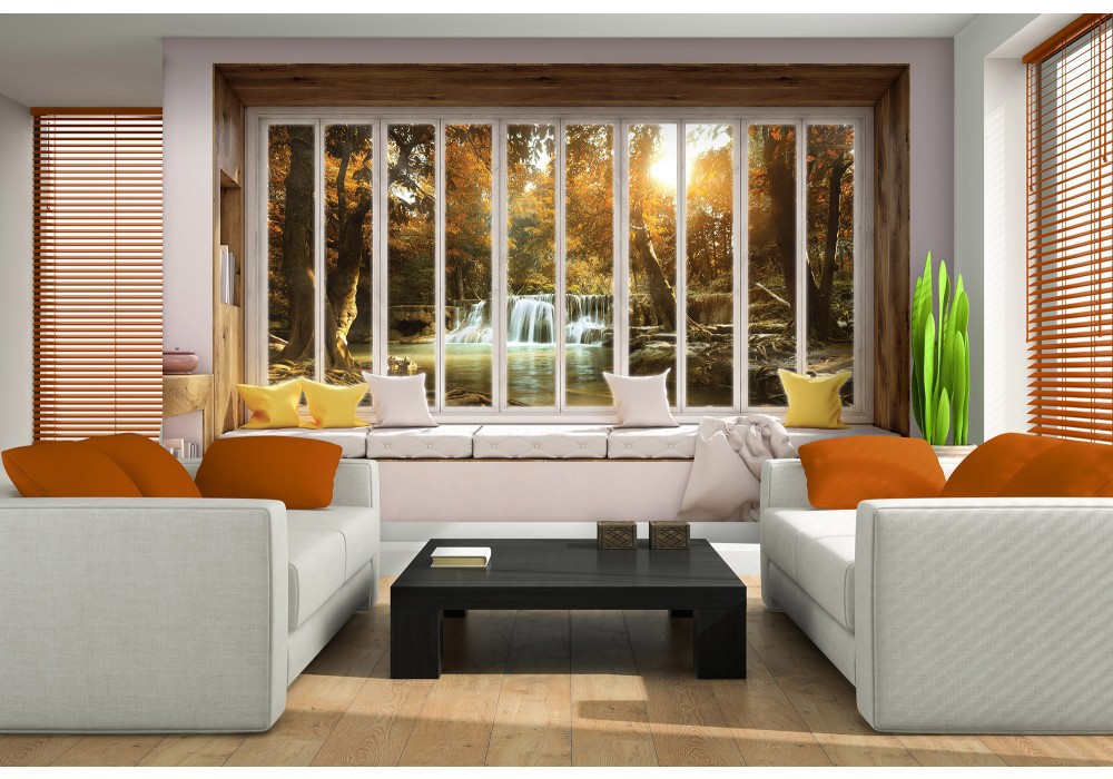 3 д флізелінові фотошпалери природа 254x184 см Вид на осінній водоспад з великого вікна (10651V4)+клей