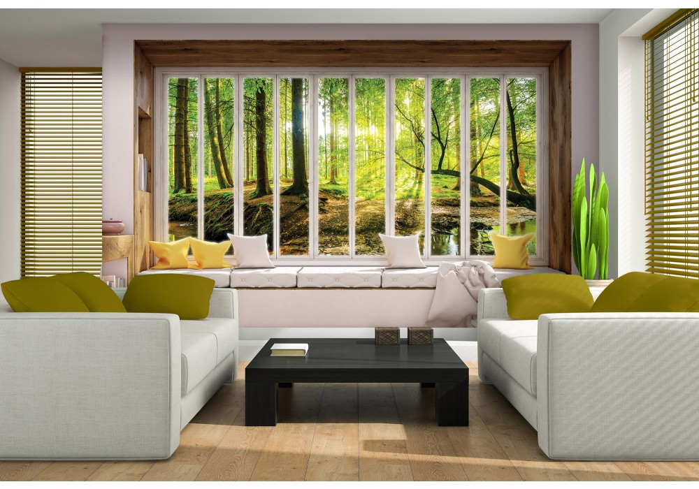 Флізелінові фотошпалери 3D 254x184 см Вид на сонячний ліс з великого вікна (10650V4)+клей