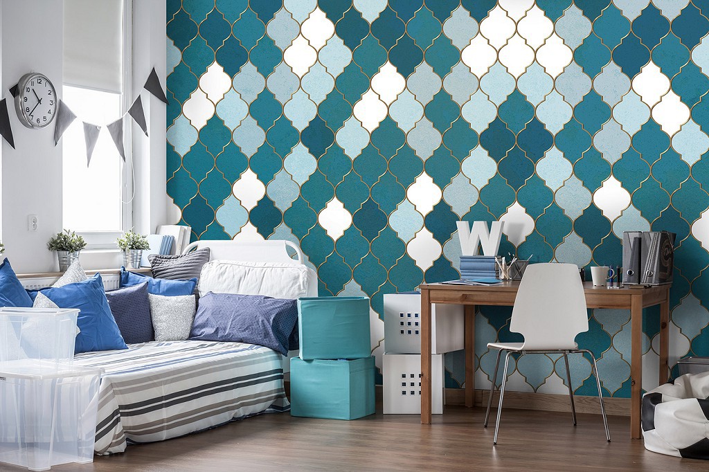 Відгуки Флізелінові фотошпалери на кухню 312x219 см Синій візерунок - марокканська конюшина (13816VEXXL)+клей