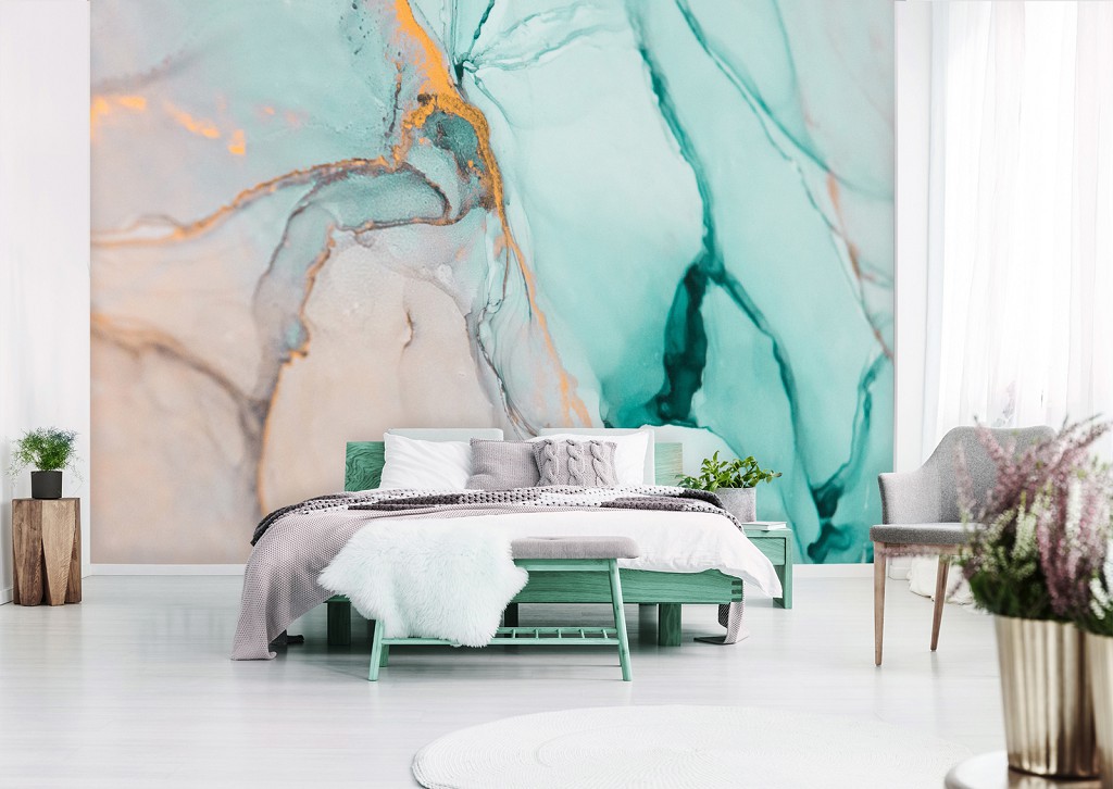 Відгуки Абстрактні флізелінові фотошпалери 368x254 см Сучасна акварельна структура Бірюзовий мармур (13554V8)+клей