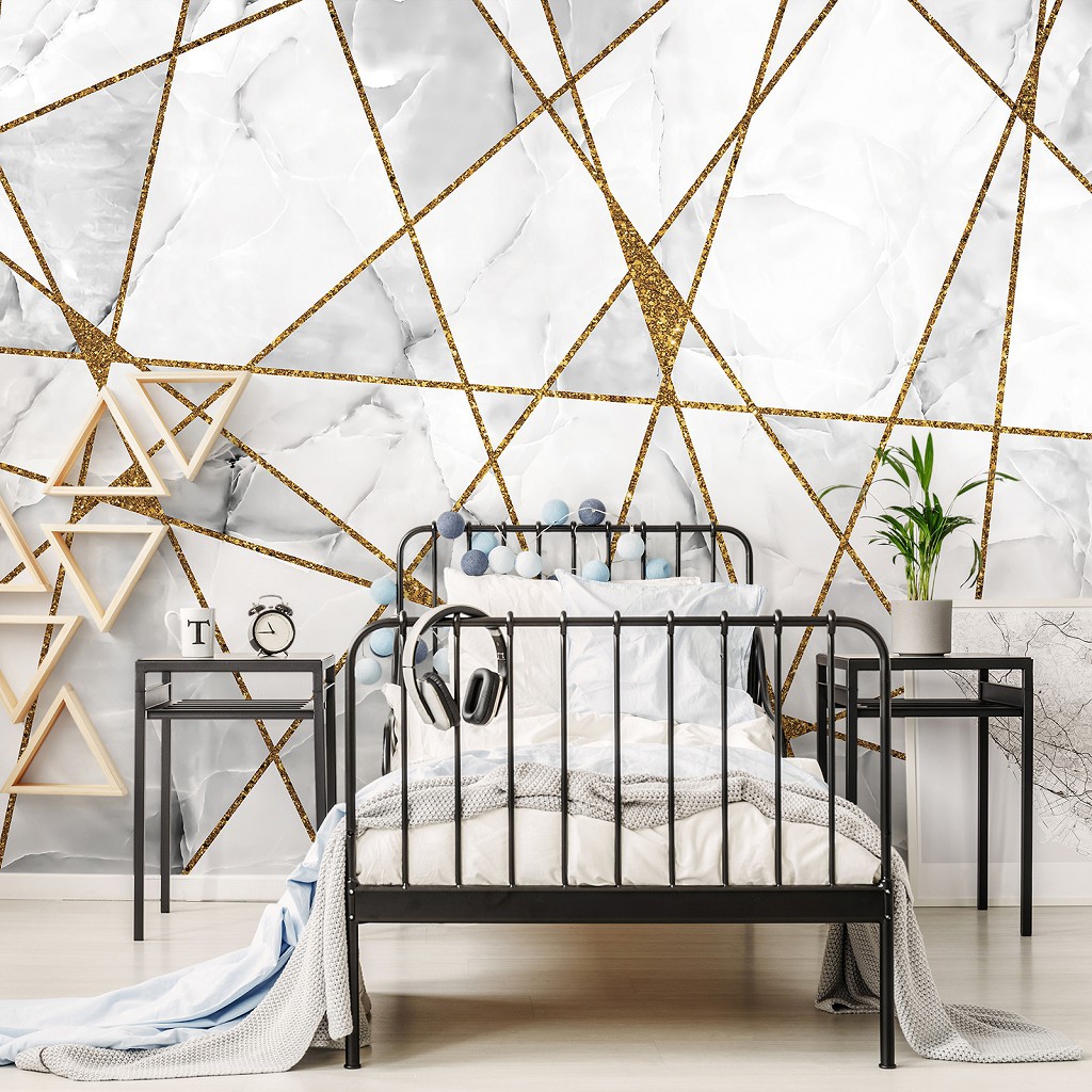 Флізелінові фотошпалери з геометричним малюнком 368x254 см Абстракція - Золоті лінії на сірий мармур (13717V8)+клей
