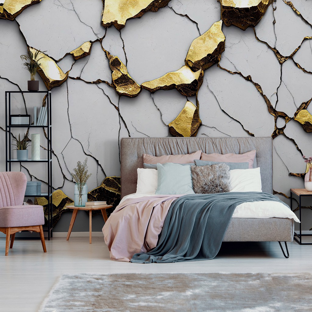 Флізелінові фотошпалери 368x254 см 3D структури Білий і золотий кам'яний гламур (14575V8)+клей