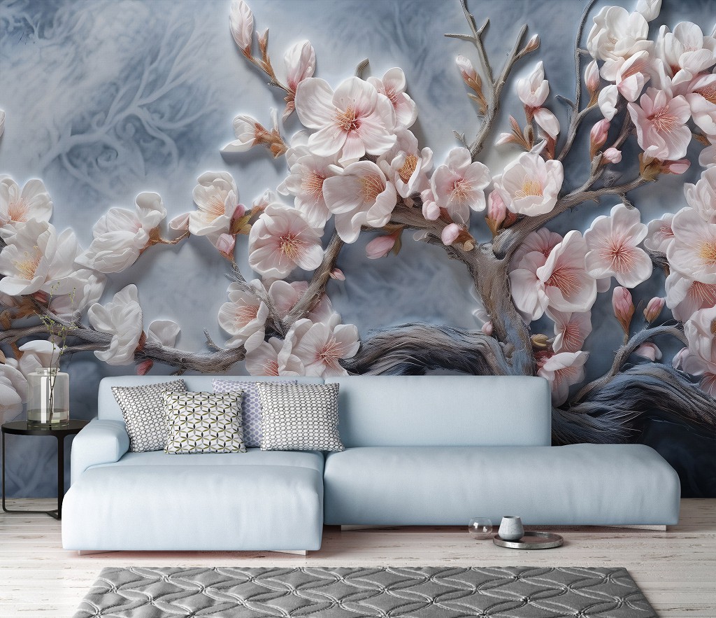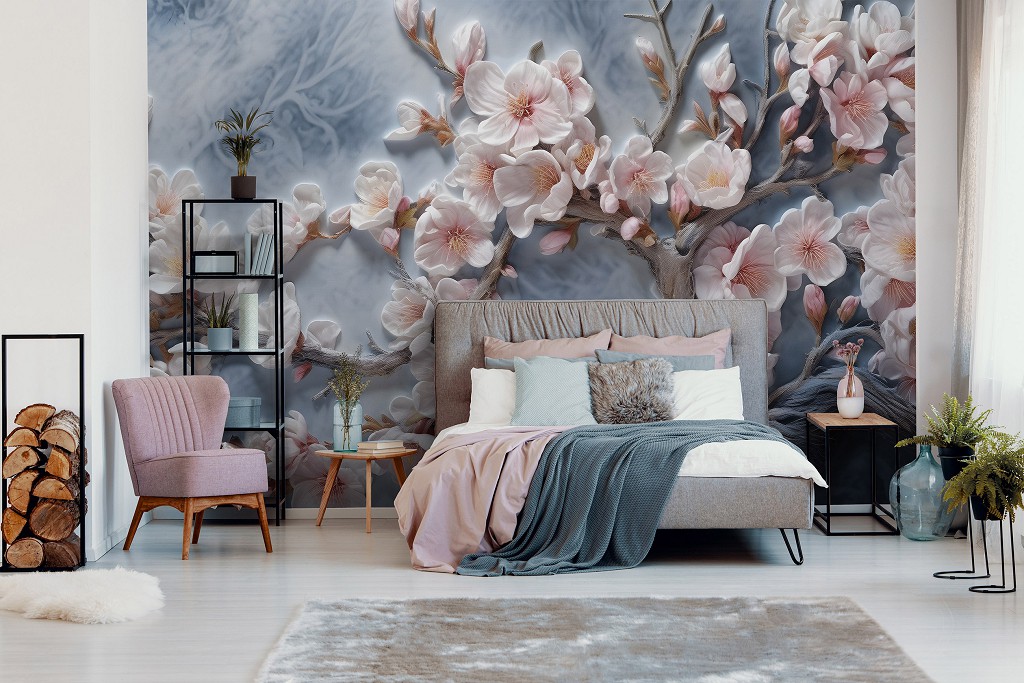 Відгуки Флізелінові 3д фотошпалери на стіну 368x254 см Гілка усіяна світло рожевими квітами на сірий фон (14754V8) +клей