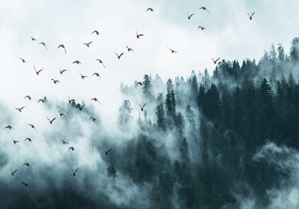 Відгуки Флізелінові 3д фотошпалери дерева природа 368x280 см Птахи та ліс у тумані (12394V10) +клей
