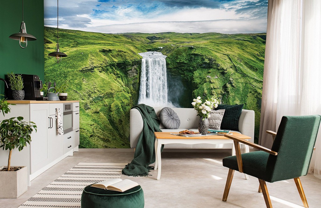 Флізелінові фотошпалери природа краєвид 416x254 см 3D Зелений водоспад Скоугафосс в Ісландії (12985VEXXXL) +клей