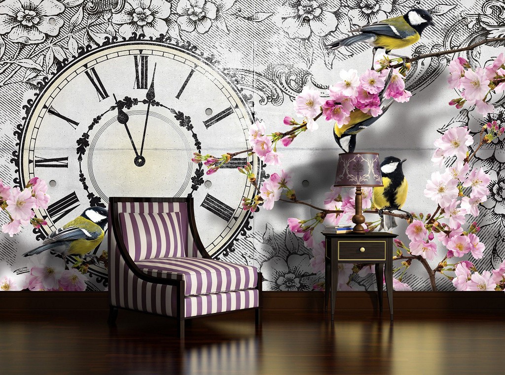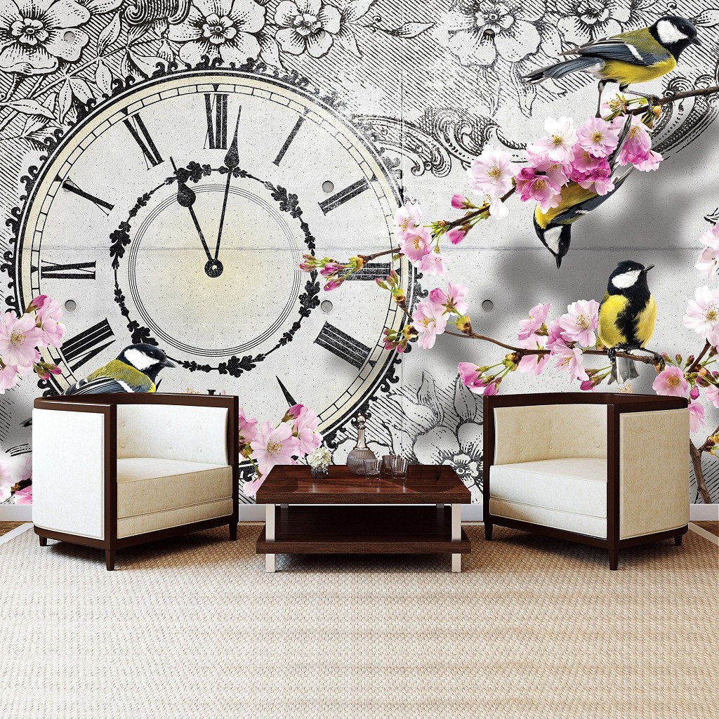 Флізелінові фотошпалери 416x254 см Годинник з квітами та пташками (1793VEXXXL)+клей