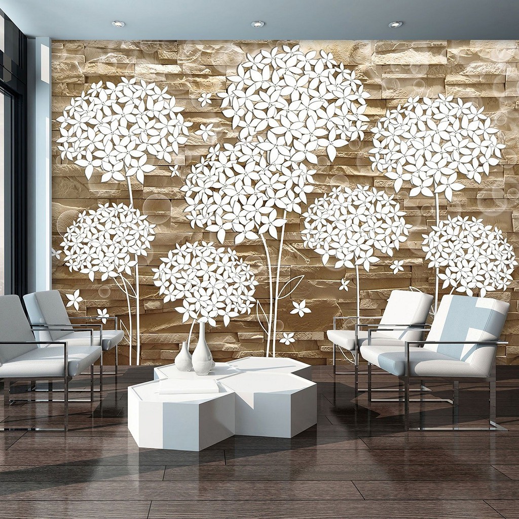 Відгуки Популярні флізелінові коричневі 3д фотошпалери 416x254 см Пухнасті білі квіти на кам'яній стіні (3503VEXXXL)+клей