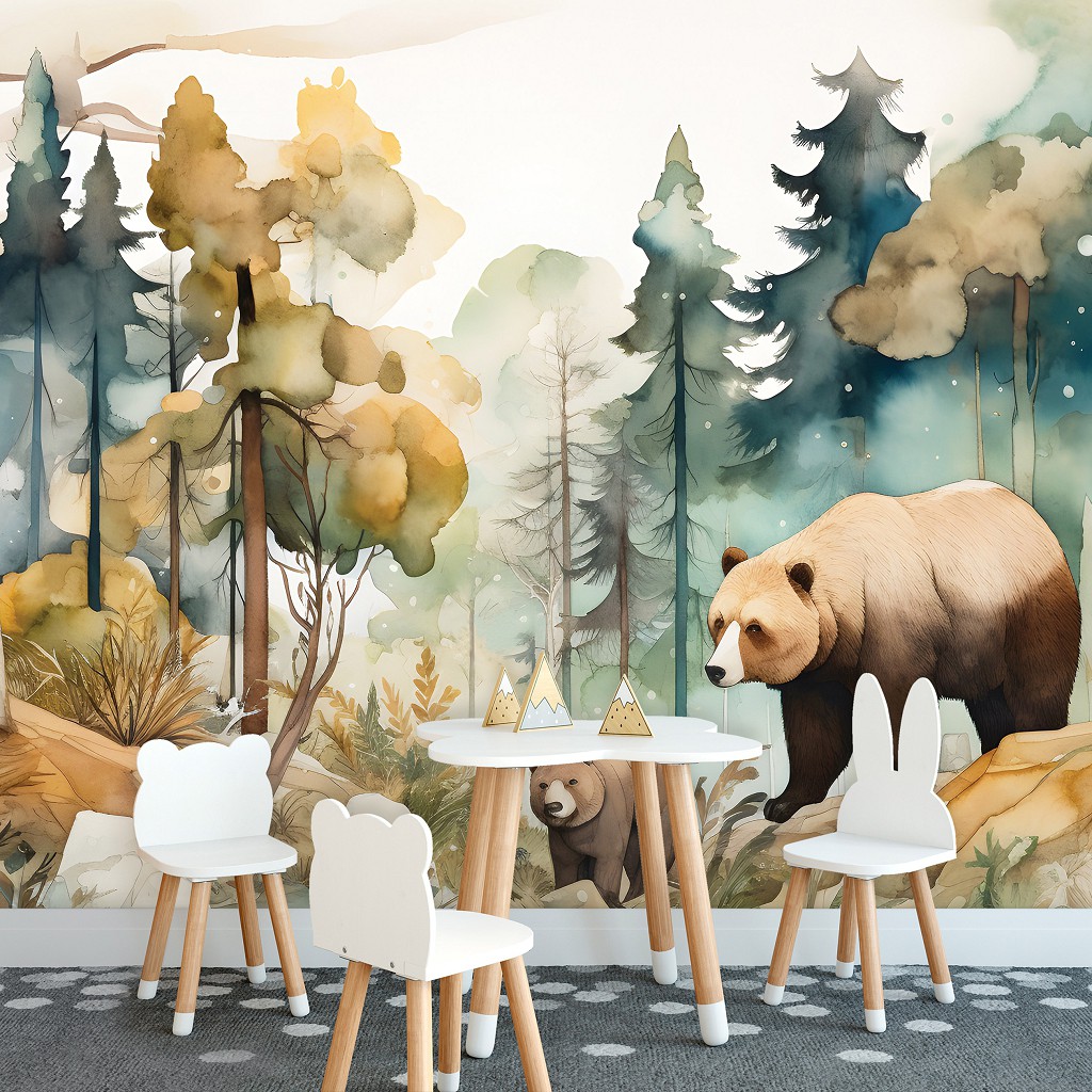 Флізелінові фотошпалери дерево 416x254 см У дитячий ліс і ведмедики аквареллю (14646VEXXXL)+клей