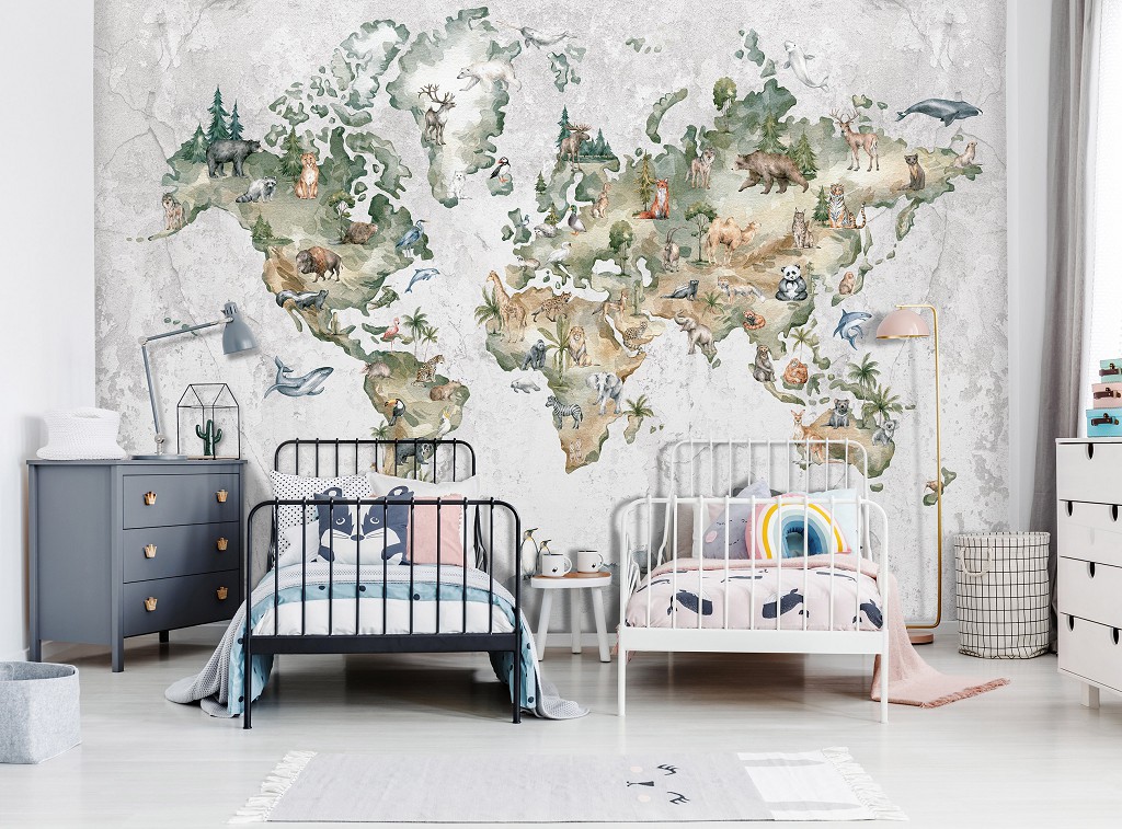 Флізелінові фотошпалери звірі Акварельна карта світу з тваринами для дітей (14421V)+клей