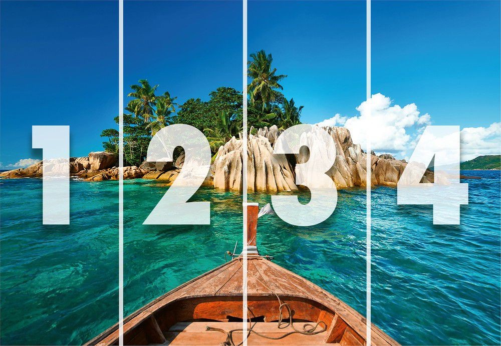 Фотошпалери 3D 368х254 см Wizard + Genius Човен припливла, Море (5033-4P-1) виготовлені швейцарською компанією Wizard + Genius на щільному напівглянцевому папері BlueBack (щільність 115 г / м2). Дані фотошпалери складаються з 4-х сегментів і мають розмір висота - 254 см і ширина - 368 см. Вага виробу становить 1,374 кг. Клей знаходиться всередині рулону.