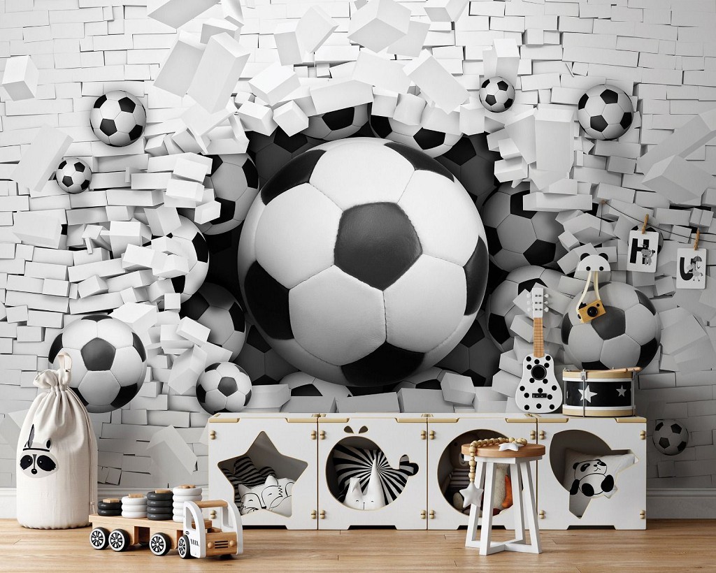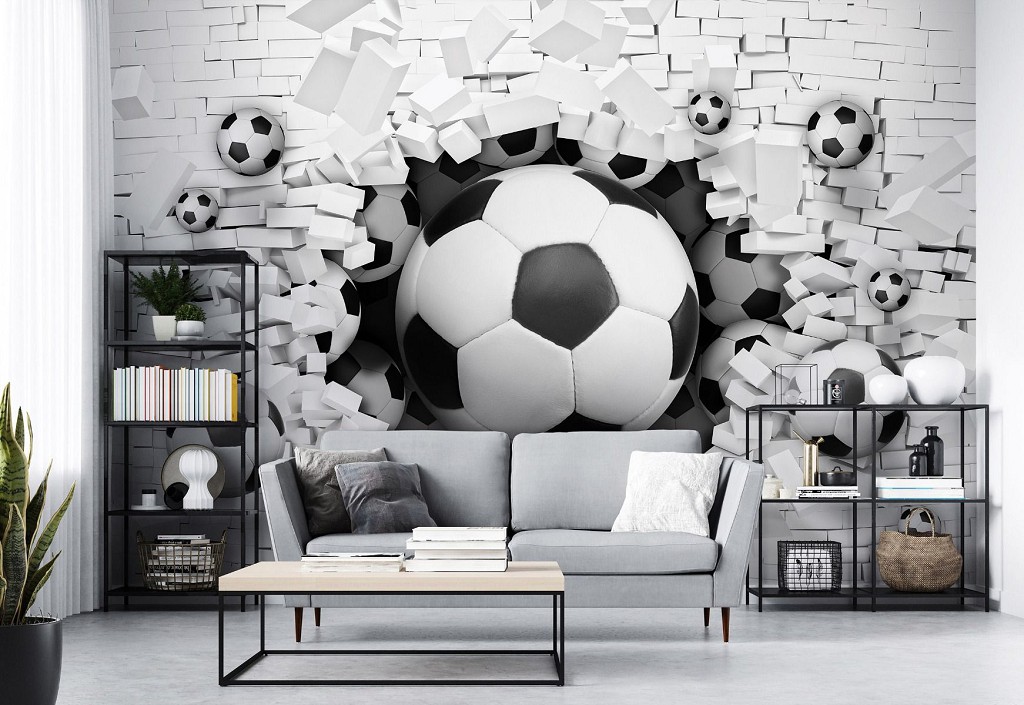 Фотошпалери флізелінові 3D 254х184 см Футбольні м'ячі крізь цегляну стіну (3383V4) надруковані на флізелін(Vlies) і складаються з 2-х частин. Ширина фотошпалер 254 см, висота - 184 см. Виріб комплектується клеєм і інструкцією. Фото шпалери важать 1,1 кг і мають щільність 140 г/м2. Завдяки ефекту 3D Ваша кімната візуально збільшиться.