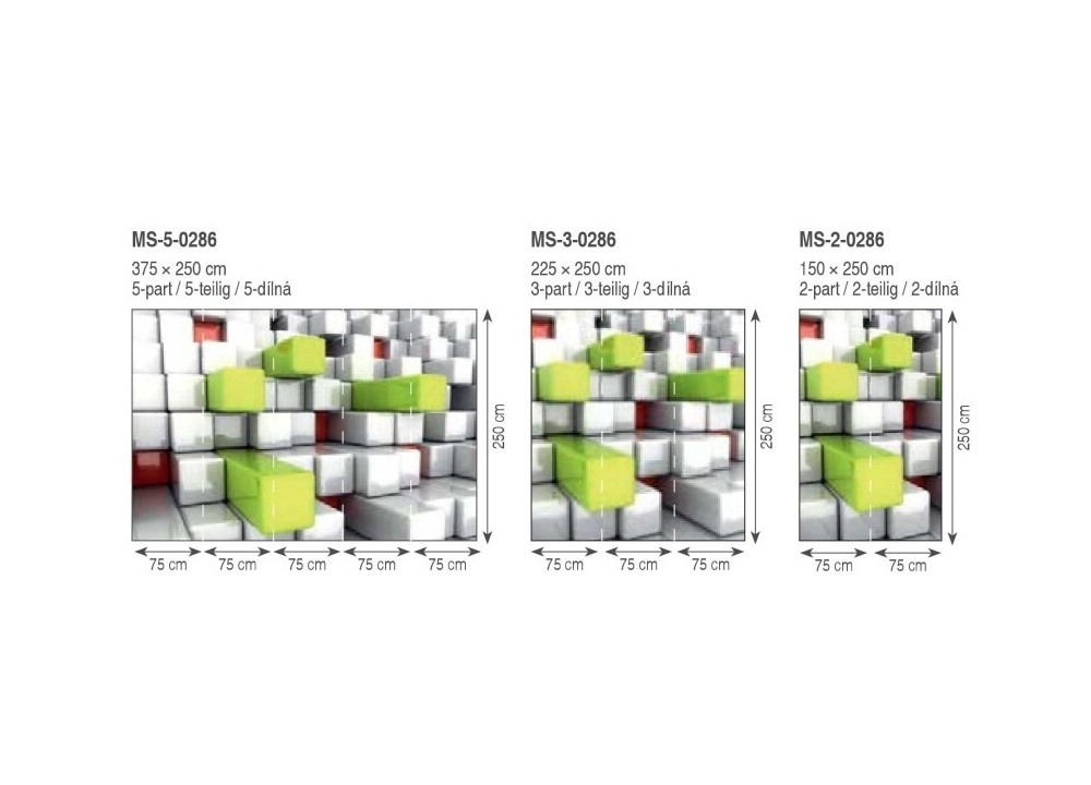 Фотошпалери Фігури Кубики (MS-5-0286) надруковані на флізеліні щільністю 150 г / м2. Висота фотошпалер 250 см, а ширина 375 см. Виробник комплектує фото шпалери клеєм і інструкцією. Фотошпалери складаються з 5 вертикальних частин і важать 1,8 кг. На фотошпалерах зображена абстракція, вони мають ефект 3D і візуально збільшать Вашу кімнату.